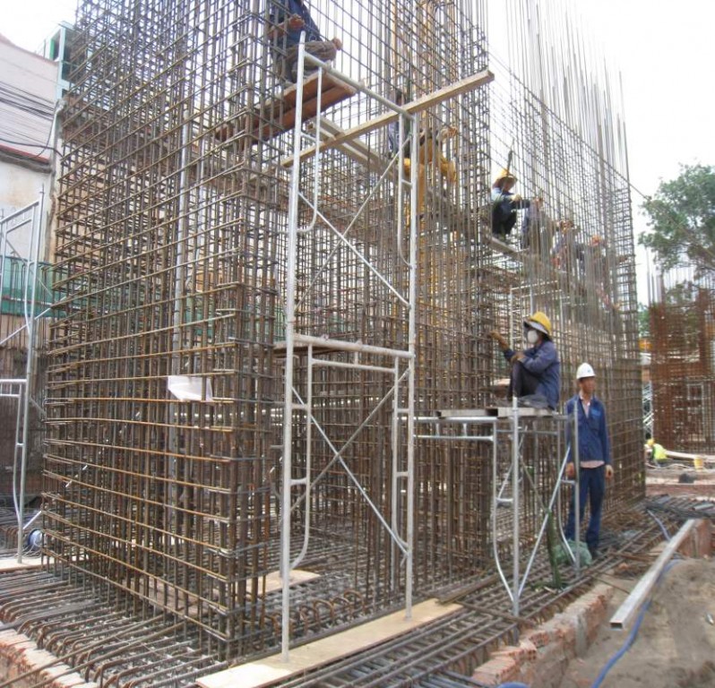 – Đặt cốt thép vào vị trí móng, chú ý đến việc định tim móng;