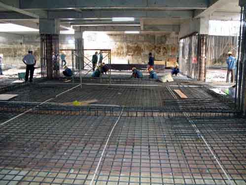 Dùng dây kẽm buộc những thanh thép con cóc vào vị trí thiết kế, vào lớp trên để đỡ lớp thép trên;